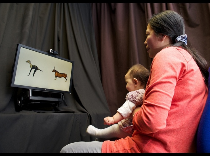 Half the babies saw a series of eight pictures on a computer screen and heard a nonsense word (e.g., “Look! A blicket!”), and the other half saw the same eight pictures, but heard two words which divided the pictures into two categories. As a real-world example, imagine a series of pictures: four cats and four kittens. One group of babies would see all eight pictures and hear “Look! A cat!”, while the other would hear “Look! A kitten!” during the kitten pictures, and “Look! A cat!” during the cat pictures. Importantly, all babies saw the same pictures in the same order: the only difference between the two groups was the word they heard.
