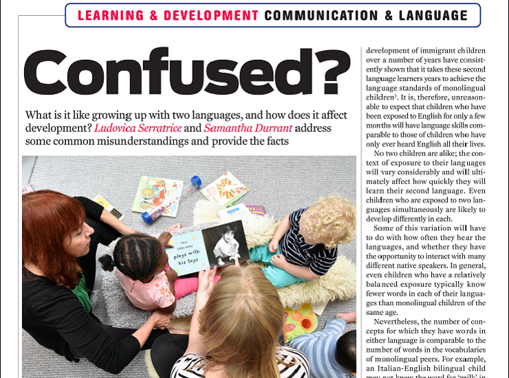 Our fourth article in Nursery World Magazine's communication and language series has been published. 'Confused?' written by Dr Ludovica Serratrice and Dr Samantha Durrant, discusses what it is like to grow up with two languages and how this affects development. They dispel common myths surrounding bilingualism and provide tips for supporting bilingual children. Read the full open access article (PDF opens in new window).