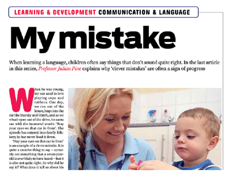 In our final Nursery World Magazine article Prof Julian Pine discusses the clever mistakes children make when learning to talk. Why do children make these errors and what should parents, caregivers and nursery workers do when they make them? Read the full open access article, My Mistake.