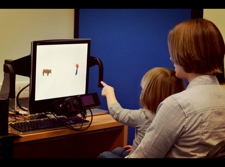 We measure a child’s speed of processing using the so-called “looking while listening paradigm”, invented by Anne Fernald’s research team. Children sit in front of a screen and see a series of paired pictures, only one of which is named (e.g. when instructed to Look at the apple, when viewing an apple and a car). We then use an eye-tracker to measure how quickly children move their eyes to look at the object being named. The speed which children identify the correct referent of the word is an indicator of how quickly they are able to process the language they hear (their processing speed).