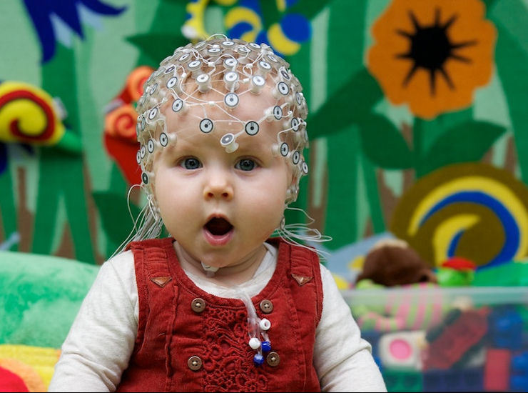 As many parents know, babies start saying their first words somewhere around their first birthday. But there is a lot going on in their brains before that as they start to make sense of the language they are learning. In my research I try to figure out what babies know about their language before they start talking. This gets a bit tricky—because they can’t talk, they can’t actually tell us what they know! So researchers like me have come up with many different ways to try to figure out what babies know before their first birthday. One way we do this is by using electroencephalogram (EEG), which is an easy way of measuring brain activity. A cap of electrodes is placed on the head and these electrodes measure tiny changes in brain activity, which can tell us what the brain is doing. Here I answer some common questions about what EEG is and how it can be used in language development research.