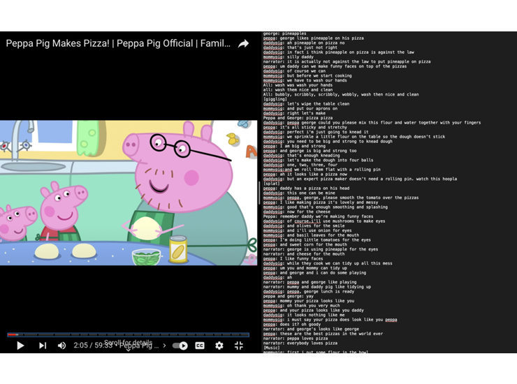 I was given the opportunity to work closely with experts like Professor Padraic Monaghan from Lancaster University, Dr. Joanna Kolak from Salford University, and Dr. Gemma Taylor, also from Salford University. This luminary trio helped me from the get-go to understand and break down language to take a closer look at what kind of language was used in YouTube videos that were catered to children. They already had a complied list of 188 videos and my job was to go through each of them and transcribe, split the transcription into utterance and analyse it.
