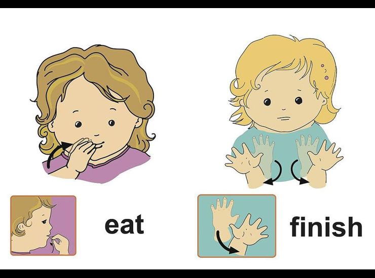 The sign for milk, for example, is made by opening and closing the hand, while the sign for “more” by tapping the ends of the fingers together.
