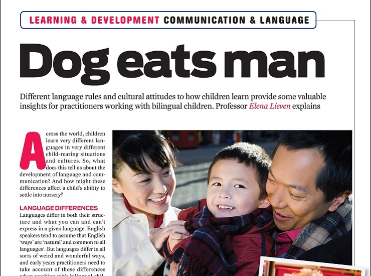Our fifth article in Nursery World Magazine's communication and language series has been published. 'Dog eats man' written by Prof Elena Lieven, describes how different language rules and cultural attitudes to how children learn provide some valuable insights for practitioners working with bilingual children.She discusses what's the same across the world and what's different in terms of child-rearing and language learning. Read the full open access article (PDF opens in new window).